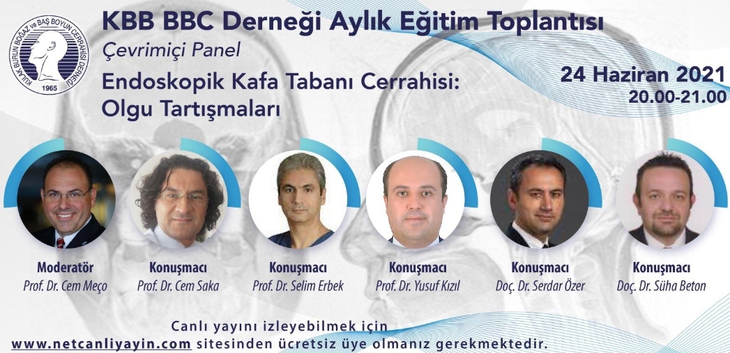 KBB BBC Derneğimizin aylık eğitim toplantıları kapsamında, moderatörlüğünü Prof. Dr. Cem Meço'nun yapacağı, Prof. Dr. Cem Saka, Prof. Dr. Selim Erbek, Prof. Dr. Yusuf Kızıl, Doç. Dr. Süha Beton ve Doç. Dr. Serdar Özer'in konuşmacı olacağı 'Endoskopik Kafa Tabanı Cerrahisi: Olgu Tartışmaları' başlıklı konu 24 Haziran 2021 tarihinde 20.00-21.00 saatleri arasında gerçekleştirilecektir. Toplantı www.netcanliyayin.com web sitesinden internet ortamında canlı olarak gerçekleşecek olup katılmak isteyen meslektaşlarımızın toplantı öncesinde aynı siteden kayıt yaptırması gerekmektedir.