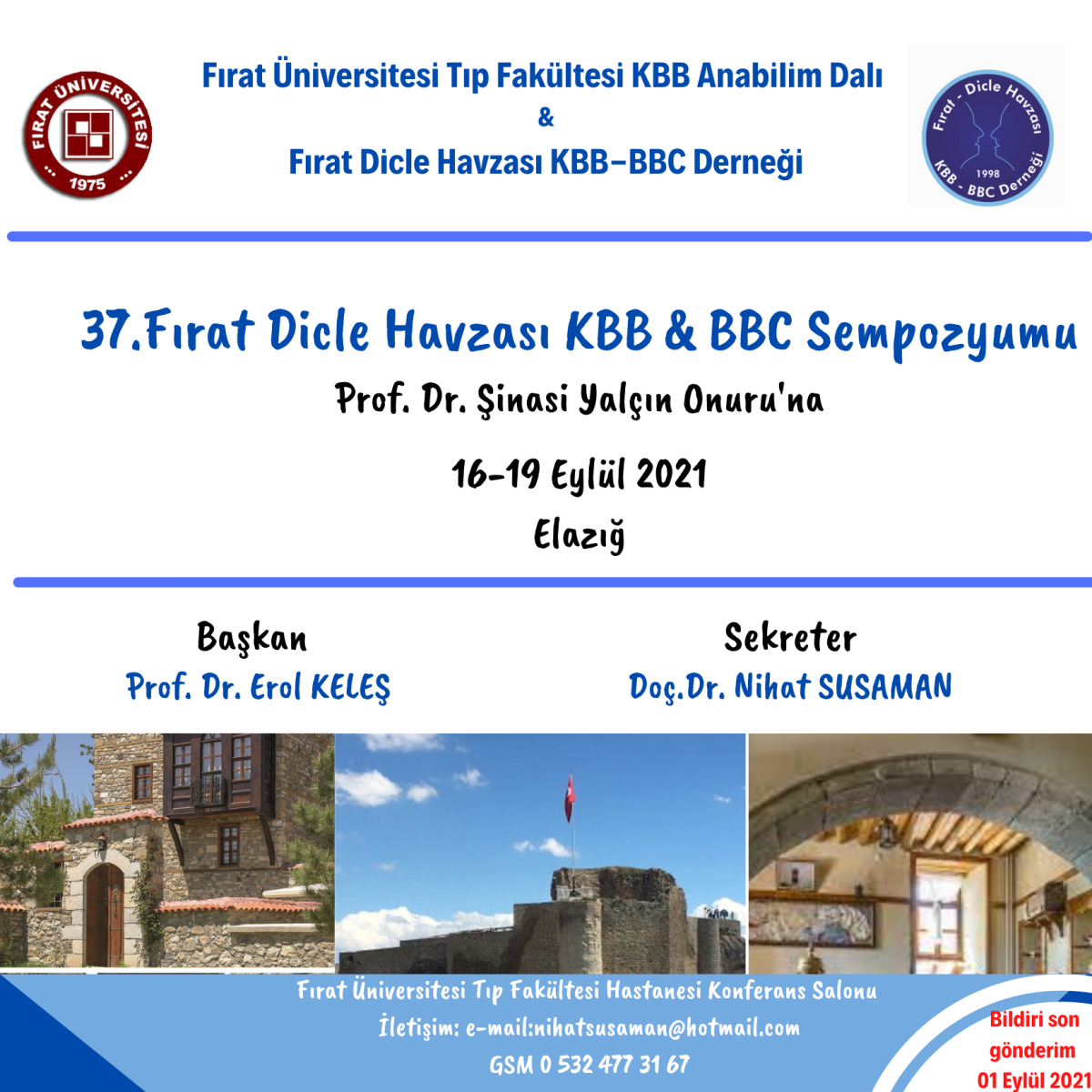 Fırat Üniversitesi Tıp Fakültesi KBB Anabilim Dalı ve Fırat-Dicle Havzası KBB ve BBC Derneği’nin ortaklaşa düzenledikleri “Prof. Dr. Şinasi Yalçın Onuru'na 37.Fırat-Dicle Havzası KBB-BBC Derneği Sempozyumu" 16-19 Eylül 2021 tarihleri arasında gerçekleştirilmesi planlanmıştır.
