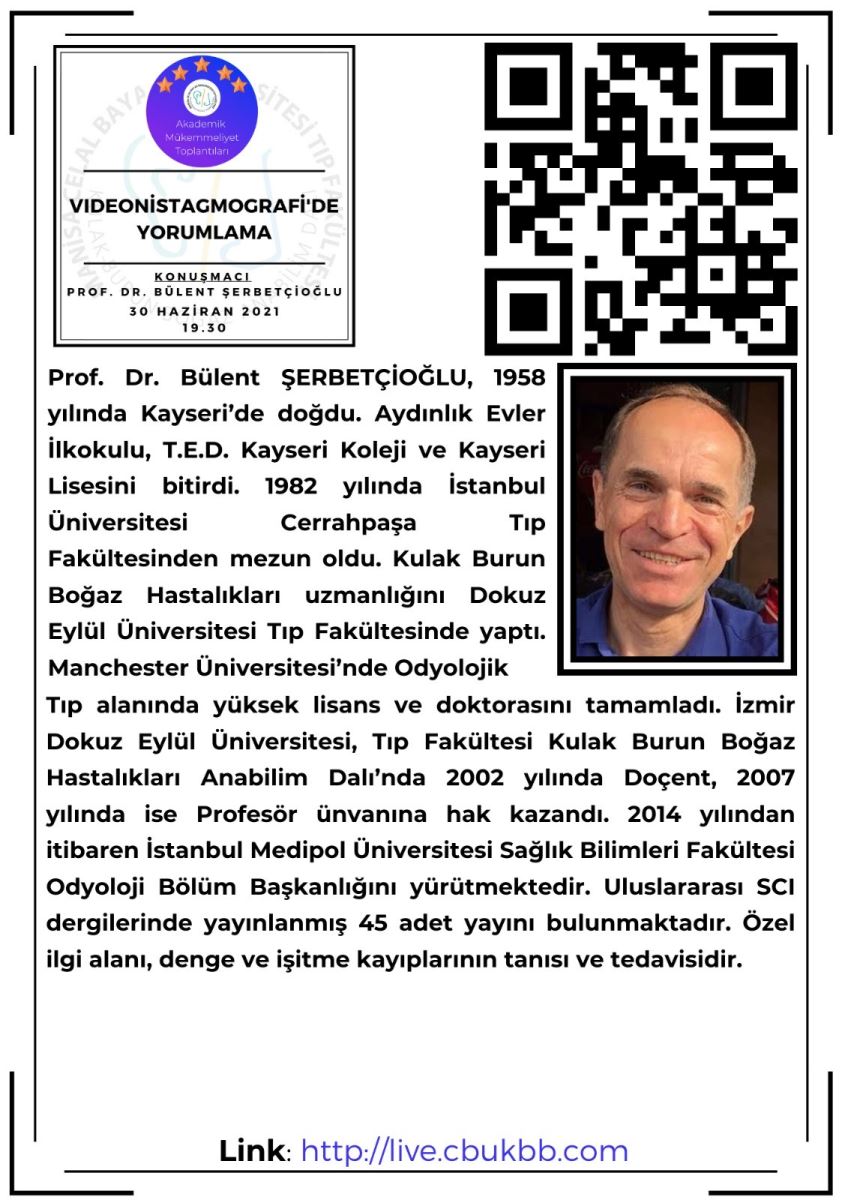 Konuşmacı: Prof. Dr. Bülent Şerbetçioğlu Konu: Videonistagmografide Yorumlama Tarih: 30 Haziran 2021 Çarşamba - 19:30