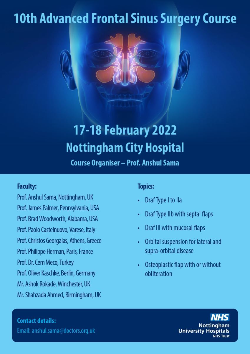 Prof Dr Cem Meço’nun da eğitmenler arasında yer aldığı 10’uncu Nottingham İleri Frontal Sinüs Cerrahisi Diseksiyon kursunun tarihleri değişmiştir. Lütfen yeni tarihleri not ediniz!