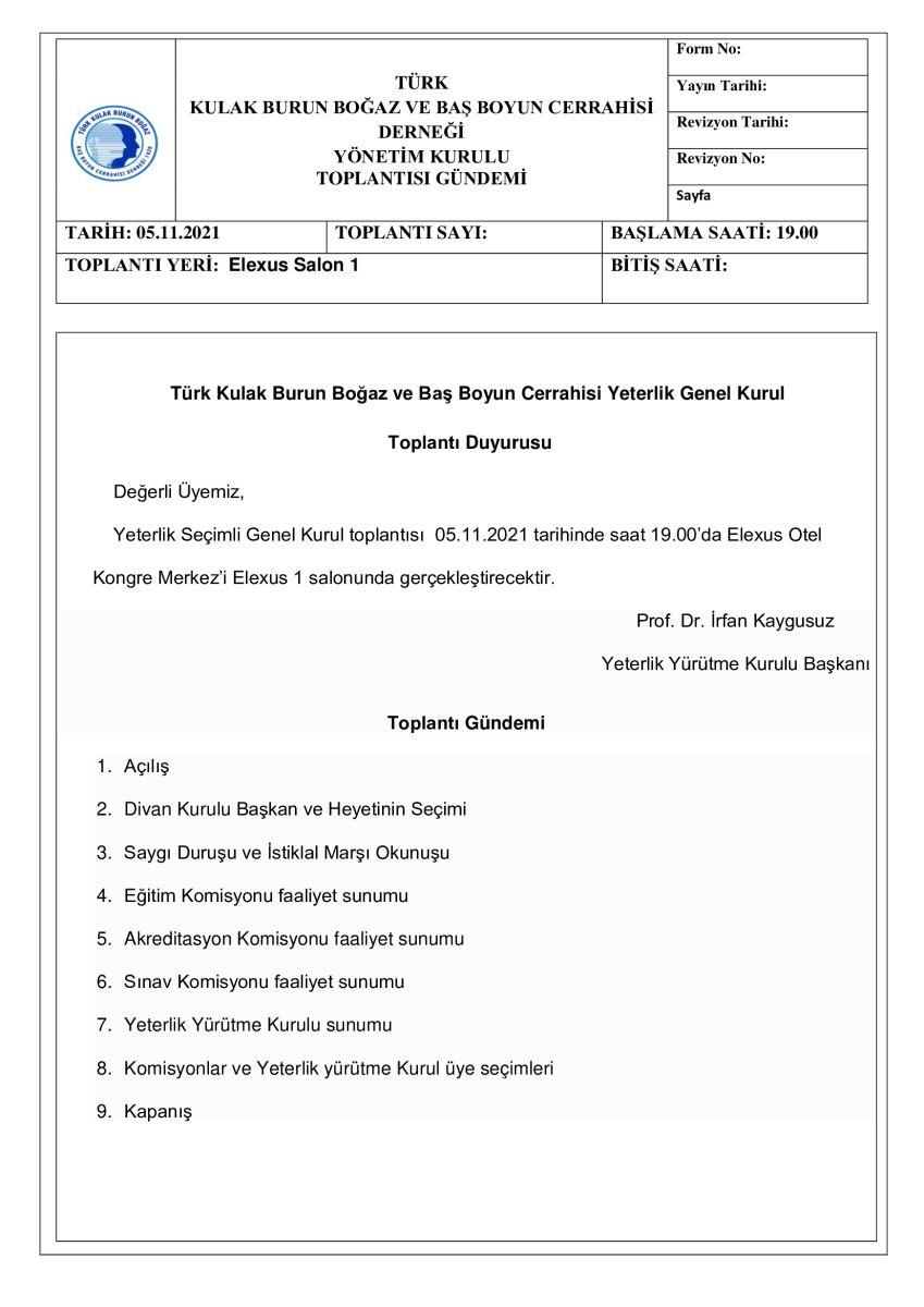 Türk Kulak Burun Boğaz ve Baş Boyun Cerrahisi Yeterlik Genel Kurul Toplantı Duyurusu