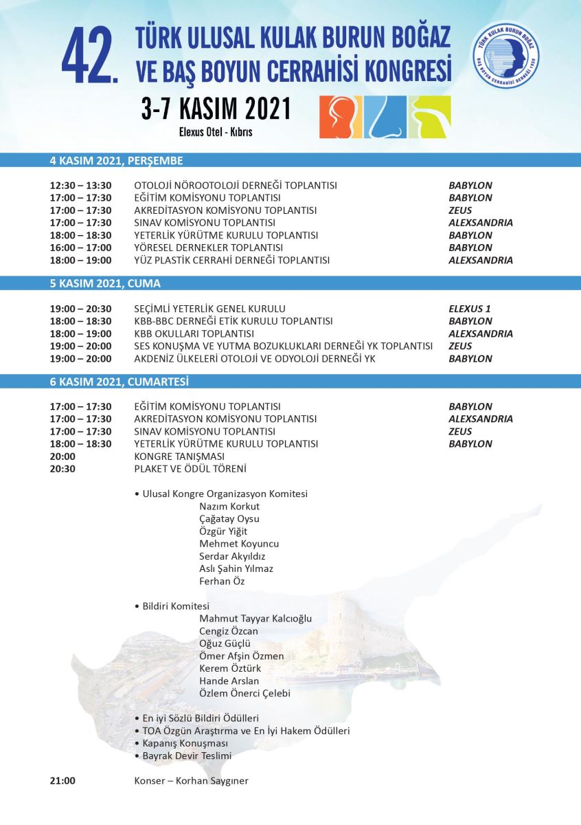 42. Türk Kulak Burun Boğaz ve Baş Boyun Cerrahisi Kongresi Kurumsal Toplantı Programı