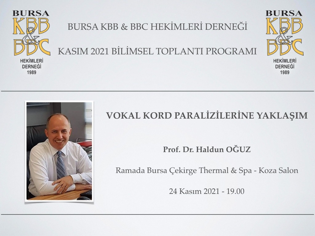 Bursa KBB & BBC Hekimleri Derneği Kasım ayı bilimsel programı 24 Kasım 2021 Çarşamba Saat 19.00’da Ramada Çekirge Thermal & Spa Otel - Koza Salon’da yüz yüze oturum şeklinde yapılacaktır. Toplantıda Sayın Prof. Dr. Haldun Oğuz ‘Vokal Kord Paralizilerine Yaklaşım’ başlıklı semineri ile bizlerle birlikte olacak. Bilgilerinize sunar, sağlıklı günler dileriz.