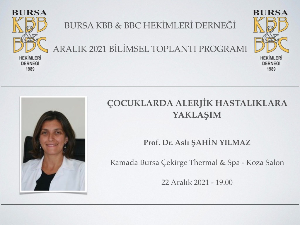Bursa KBB & BBC Hekimleri Derneği Aralık ayı bilimsel programı 22 Aralık 2021 Çarşamba Saat 19.00’da Ramada Çekirge Thermal & Spa Otel - Koza Salon’da yüz yüze oturum şeklinde yapılacaktır. Toplantıda Sayın Prof. Dr. Aslı Şahin Yılmaz ‘Çocuklarda Alerjik Hastalıklara Yaklaşım’ başlıklı semineri ile bizlerle birlikte olacak. Bilgilerinize sunar, sağlıklı günler dileriz.