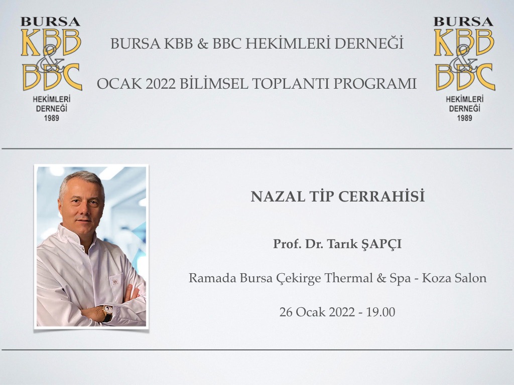 Bursa KBB & BBC Hekimleri Derneği Ocak ayı bilimsel programı 26 Ocak 2022 Çarşamba Saat 19.00’da Ramada Çekirge Thermal & Spa Otel - Koza Salon’da yüz yüze oturum şeklinde yapılacaktır. Toplantıda Sayın Prof. Dr. Tarık Şapçı ‘Nazal Tip Cerrahisi’ başlıklı semineri ile bizlerle birlikte olacak. Bilgilerinize sunar, sağlıklı günler dileriz.