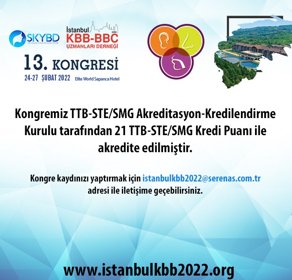 İstanbul KBB BBC Uzmanları Derneği 13. Kongresi akreditasyonu, TTB-STE/SMG Akreditasyon-Kredilendirme Kurulu tarafından akredite edilip 21 TTB-STE/SMG Kredi Puanı verilmiştir