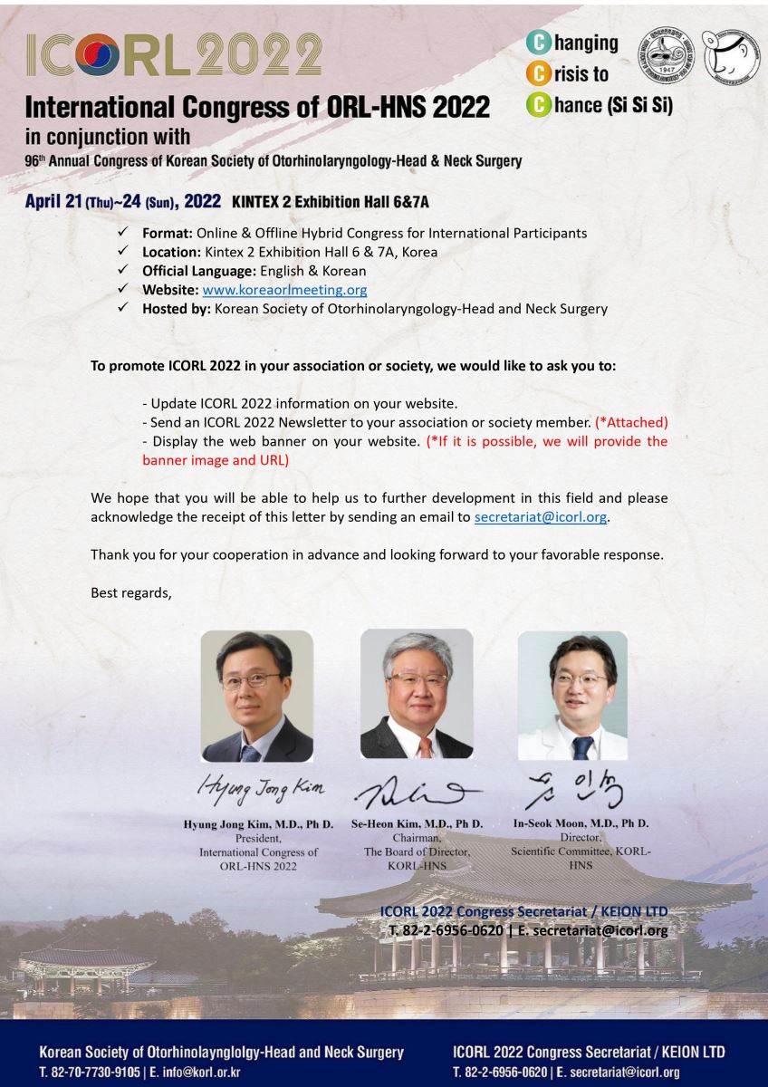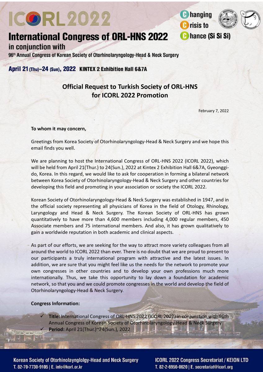 International Congress of ORL-HNS 2022 21-24 Nisanda Korede Gerçekleştirilecektir.