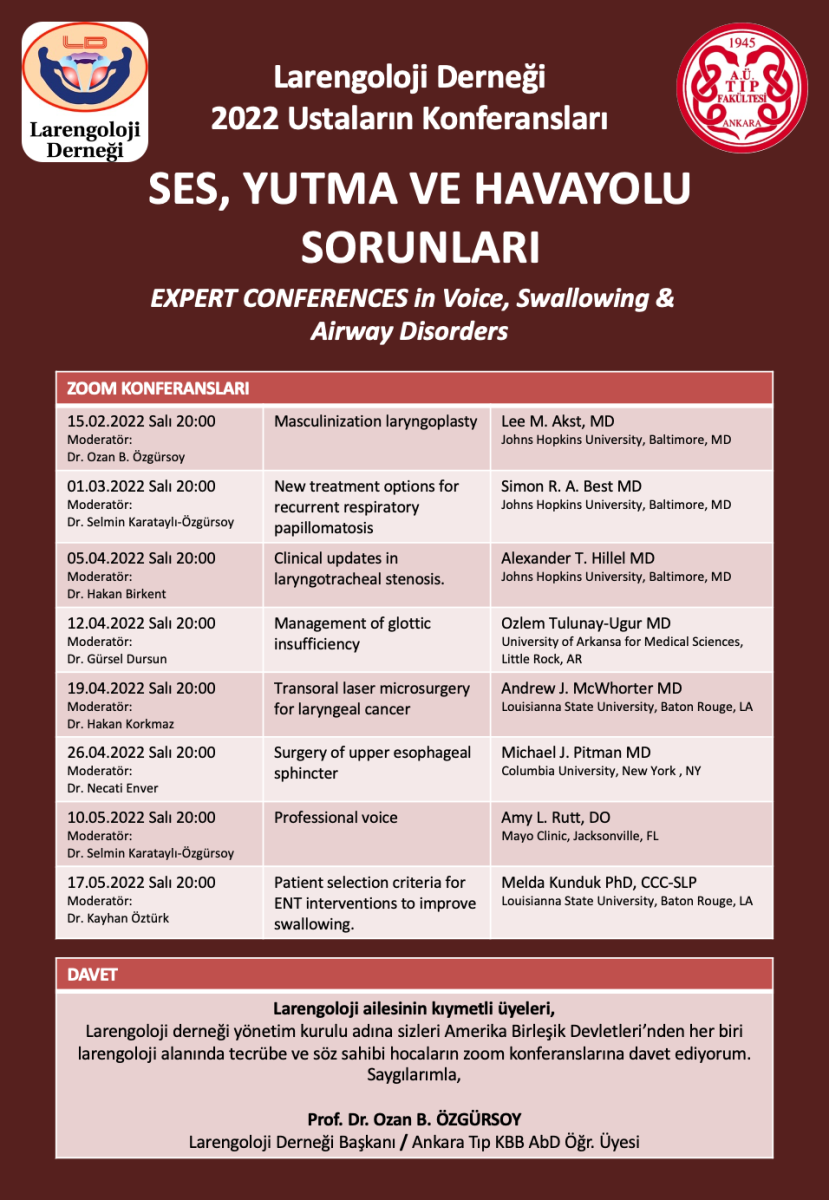 Larengoloji derneği yönetim kurulu adına sizleri Amerika Birleşik Devletleri’nden her biri larengoloji alanında tecrübe ve söz sahibi hocaların zoom konferanslarına davet ediyorum.