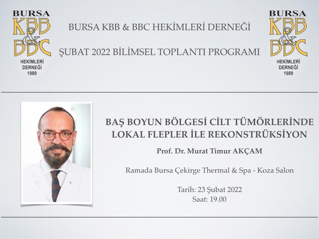 Bursa KBB & BBC Hekimleri Derneği Şubat ayı bilimsel programı 23 Şubat 2022 Çarşamba Saat 19.00’da Ramada Çekirge Thermal & Spa Otel - Koza Salon’da yüz yüze oturum şeklinde yapılacaktır. Toplantıda Sayın Prof. Dr. Murat Timur AKÇAM ‘Baş Boyun Bölgesi Cilt Tümörlerinde Lokal Flepler İle Rekonstrüksiyon’ başlıklı semineri ile bizlerle birlikte olacak. Bilgilerinize sunar, sağlıklı günler dileriz.
