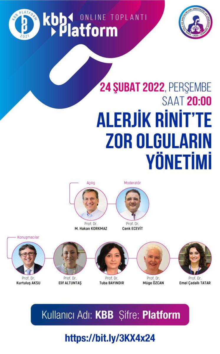 KBB PLATFORM Online Toplantısı "ALERJİK RİNİT'TE ZOR OLGULARIN YÖNETİMİ" başlıklı toplantı 24 Şubat Perşembe günü saat 20:00'de yapılacaktır. Toplantıya https://bit.ly/3KX4x24 adresinden katılabilirsiniz.