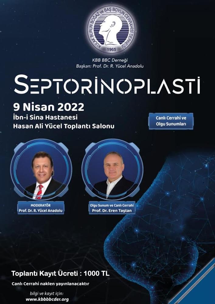 KBB BBC Derneğimiz tarafından 9 Nisan 2022 tarihinde düzenlenecek “Septorinoplasti, Canlı Cerrahi ve Olgu Tartışmaları” başlıklı toplantımızda, Septorinoplasti konusunun ülkemizde önde gelen isimlerinden Prof. Dr. Eren Taştan canlı cerrahi uygulama ve tecrübelerini bizlerle paylaşacak, ardından olgu tartışmaları ve revizyon olgularında cerrahi teknikler sunulacaktır.