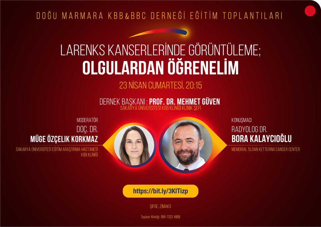 Doğu Marmara KBB&BBC Derneği tarafından her ay gerçekleştirilen eğitim toplantılarından Nisan ayı toplantısı online olarak düzenlenecektir. New York Memorial Sloan Kattering Onkoloji Hastanesinden Uzm. Rad. Dr. Bora Kalaycıoğlu’ nun konuşmacı olarak yer alacağı toplantının konu başlığı “Larenks Kanserlerinde Görüntüleme: Olgulardan Öğrenelim” olarak belirlenmiştir. Larenks kanserlerinde radyolojik görüntülemede önemli noktaların tartışılacağı bu toplantıya tüm meslektaşlarımız davetlidir.