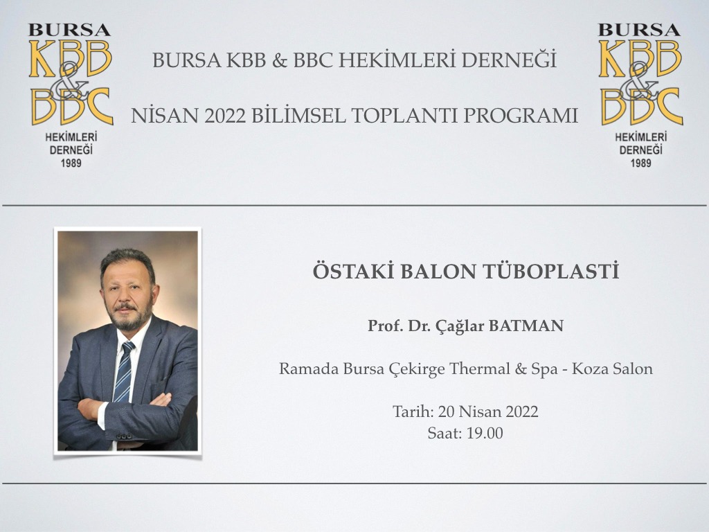 Bursa KBB & BBC Hekimleri Derneği Nisan ayı bilimsel programı 20 Nisan 2022 Çarşamba Saat 19.00’da Ramada Çekirge Thermal & Spa Otel - Koza Salon’da yüz yüze oturum şeklinde yapılacaktır. Toplantıda Sayın Prof. Dr. Çağlar BATMAN ‘Östaki Balon Tüboplasti’ başlıklı semineri ile bizlerle birlikte olacak. Bilgilerinize sunar, sağlıklı günler dileriz.
