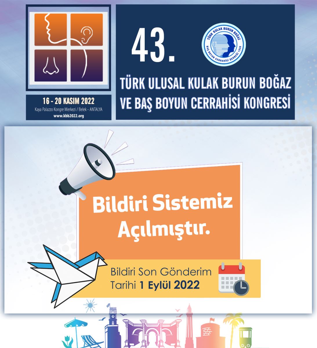 43.Türk Ulusal Kulak Burun Boğaz ve Baş Boyun Cerrahisi Kongresi Son Bildiri Gönderim Tarihi: 1 Eylül 2022