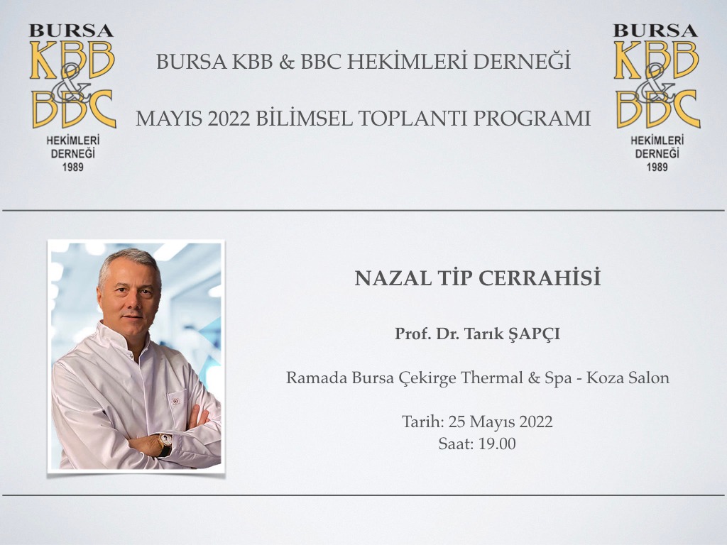 Bursa KBB & BBC Hekimleri Derneği Mayıs ayı bilimsel programı 25 Mayıs 2022 Çarşamba Saat 19.00’da Ramada Çekirge Thermal & Spa Otel - Koza Salon’da yüz yüze oturum şeklinde yapılacaktır. Toplantıda Sayın Prof. Dr. Tarık ŞAPÇI ‘Nazal Tip Cerrahisi’ başlıklı semineri ile bizlerle birlikte olacak. Bilgilerinize sunar, sağlıklı günler dileriz.