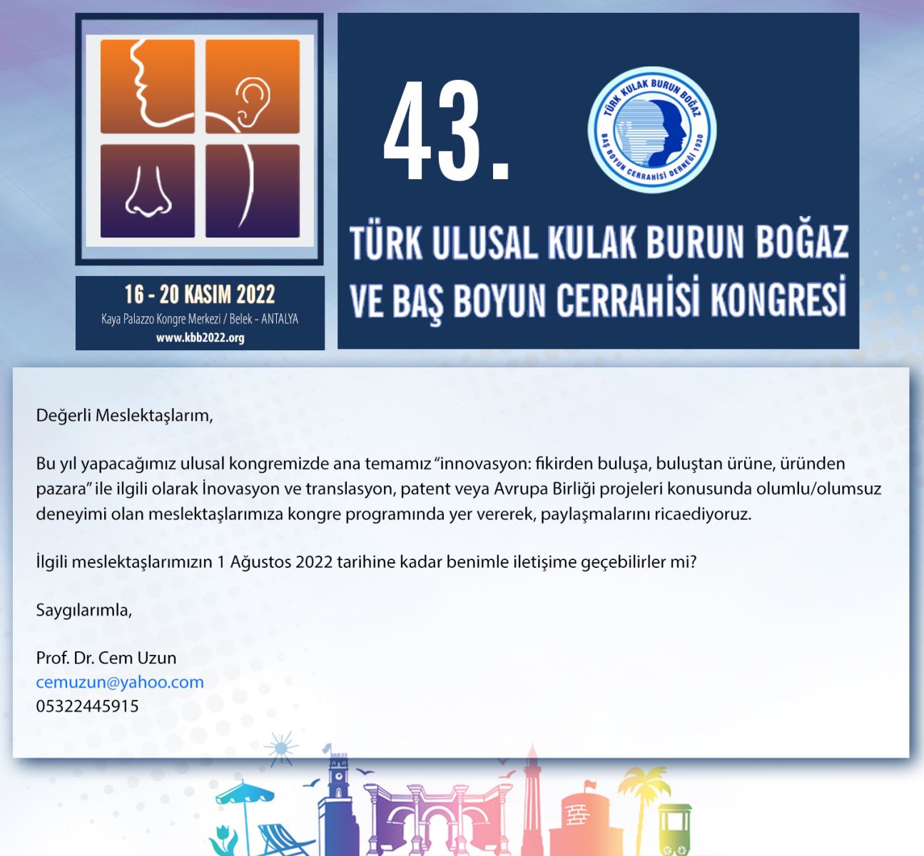 43 Türk Ulusal Kulak Burun Boğaz ve Baş Boyun Cerrahisi Kongresi Prof. Dr. Cem Uzun'dan Duyuru !