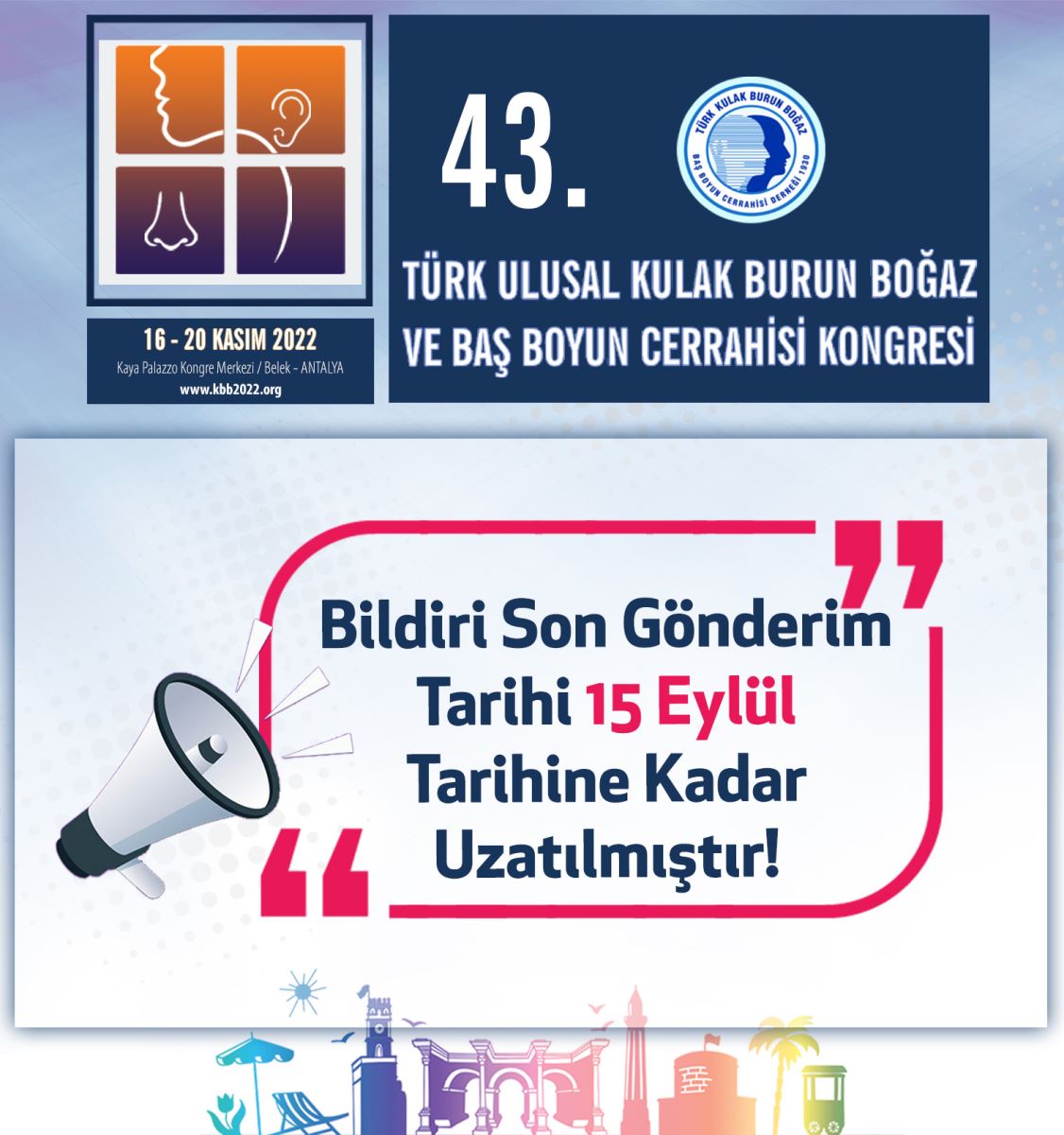 43.Türk Ulusal Kulak Burun Boğaz ve Baş Boyun Cerrahisi Kongresi Son Bildiri Gönderim Tarihi 15 Eylül Tarihine Uzatıldı