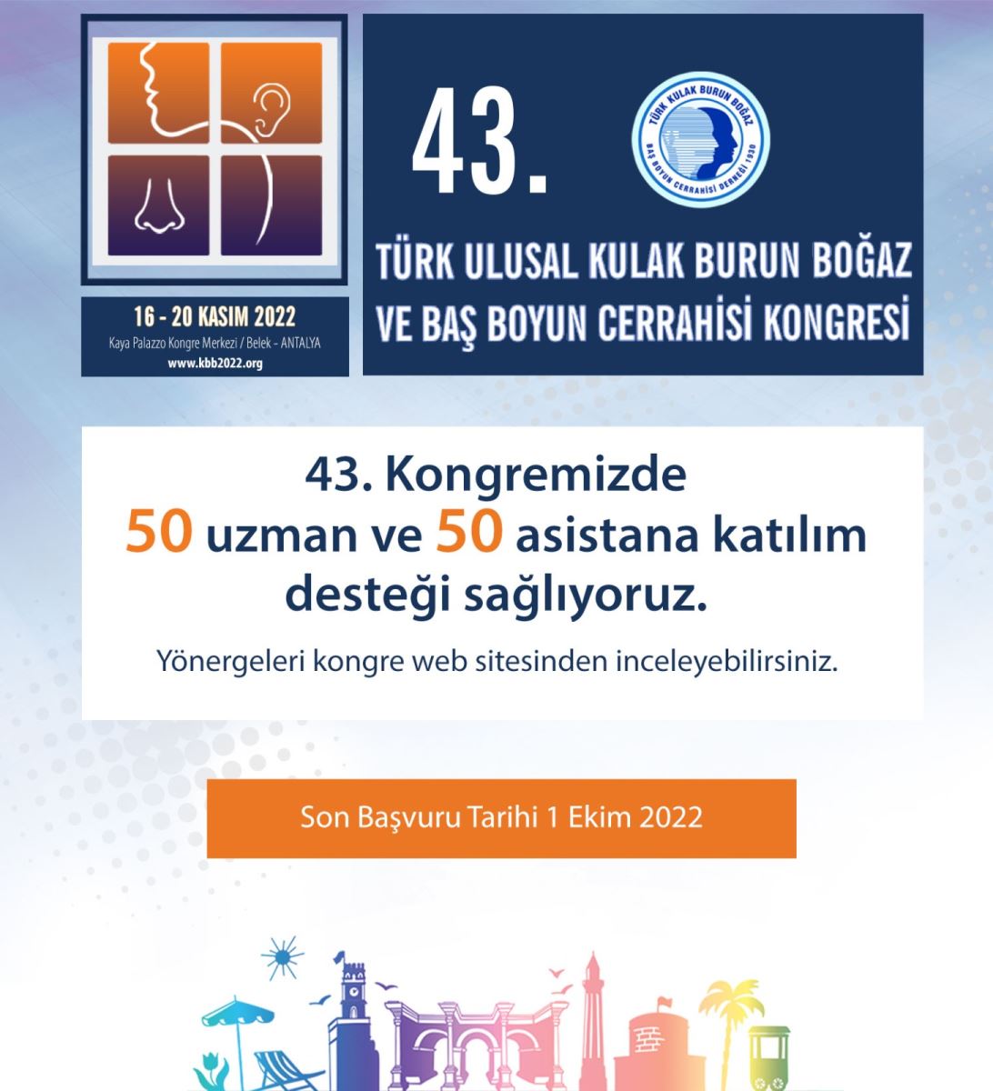 43.Türk Ulusal Kulak Burun Boğaz ve Baş Boyun Cerrahisi Kongresi Asistan ve Uzman Desteği Son Başvuru Tarihi: 1 Ekim 2022