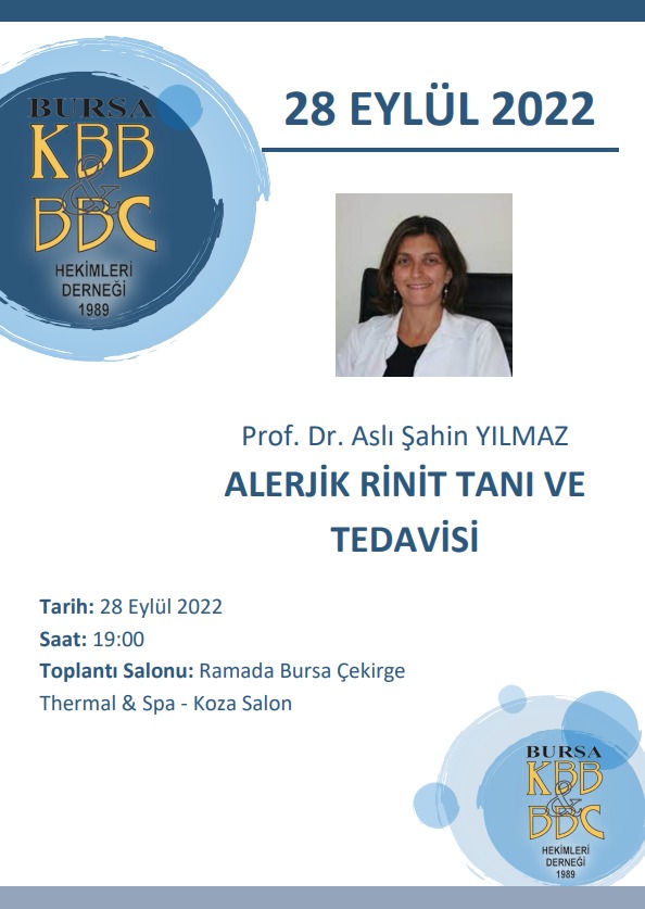 Bursa KBB & BBC Hekimleri Derneği Eylül Ayı Bilimsel Toplantı Programında Sayın Prof. Dr. Aslı Şahin Yılmaz ‘Alerjik Rinit Tanı ve Tedavisi’ başlıklı konferansı ile bizlerle birlikte olacak. 28 Eylül 2022 Çarşamba günü saat 19.00’da Ramada Bursa Çekirge Thermal & Spa - Koza Salonda gerçekleştirilecek programa tüm meslektaşlarımız davetlidir.