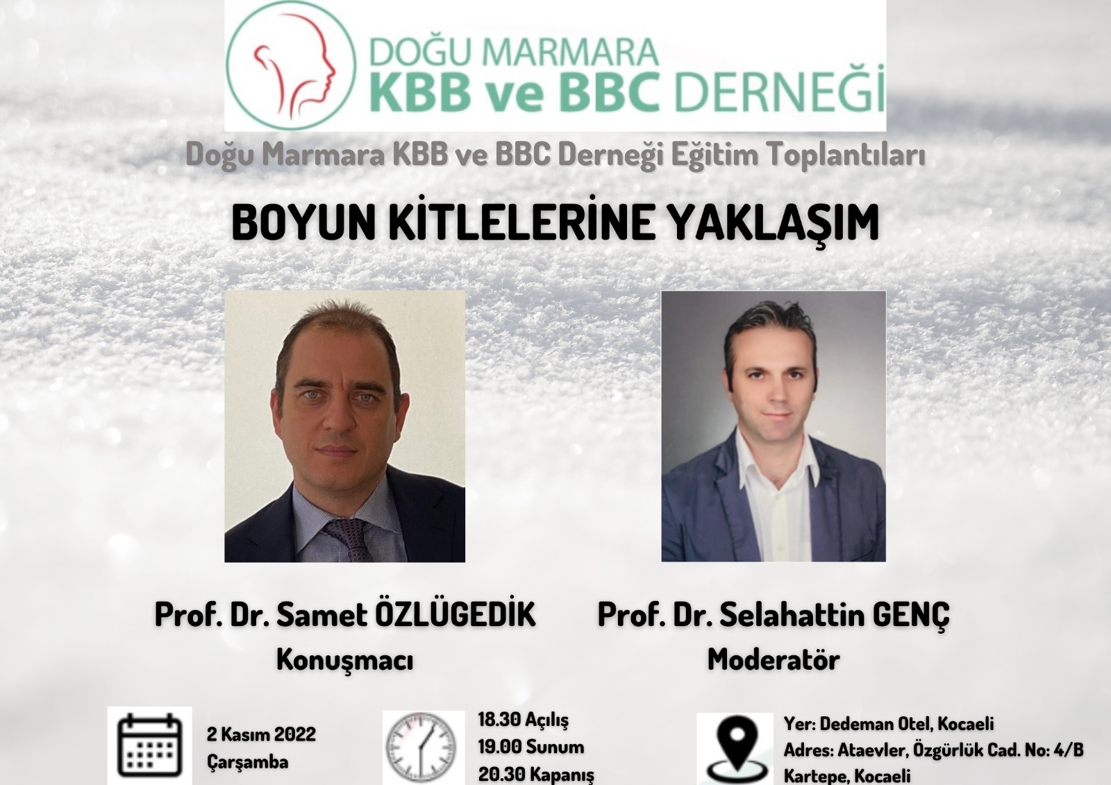 Moderatörlüğünü Kocaeli Derince Eğitim ve Araştırma Hastanesi Kulak Burun Boğaz Hastalıkları Kliniğinden Prof. Dr. Selahattin Genç'in yaptığı, Ankara Dr. Abdurrahman Yurtaslan Onkoloji Sağlık Uygulama ve Araştırma Merkezi Kulak Burun Boğaz Kliniği'nden Prof. Dr. Samet Özlügedik'in konuşmacı olarak yer alacağı "Boyun Kitlelerine Yaklaşım" konulu toplantımıza tüm meslektaşlarımız davetlidir.
