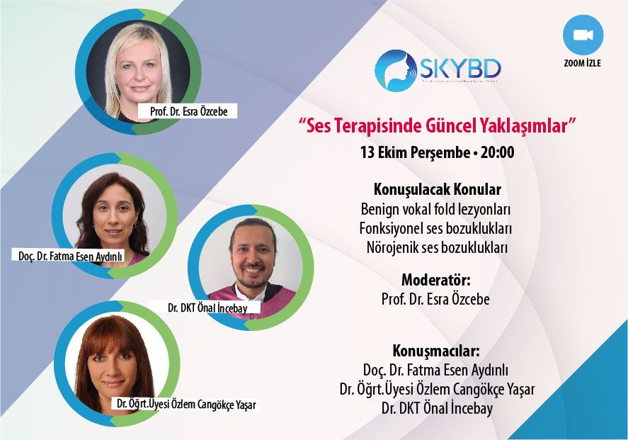13 Ekim Persembe aksami “ses terapisinde guncel yaklasimlar” webinarina davetlisiniz. Ses konusma yutma bozuklukları derneğinin bu yılki egitim toplantılarının ilki persembe saat :20:00 de