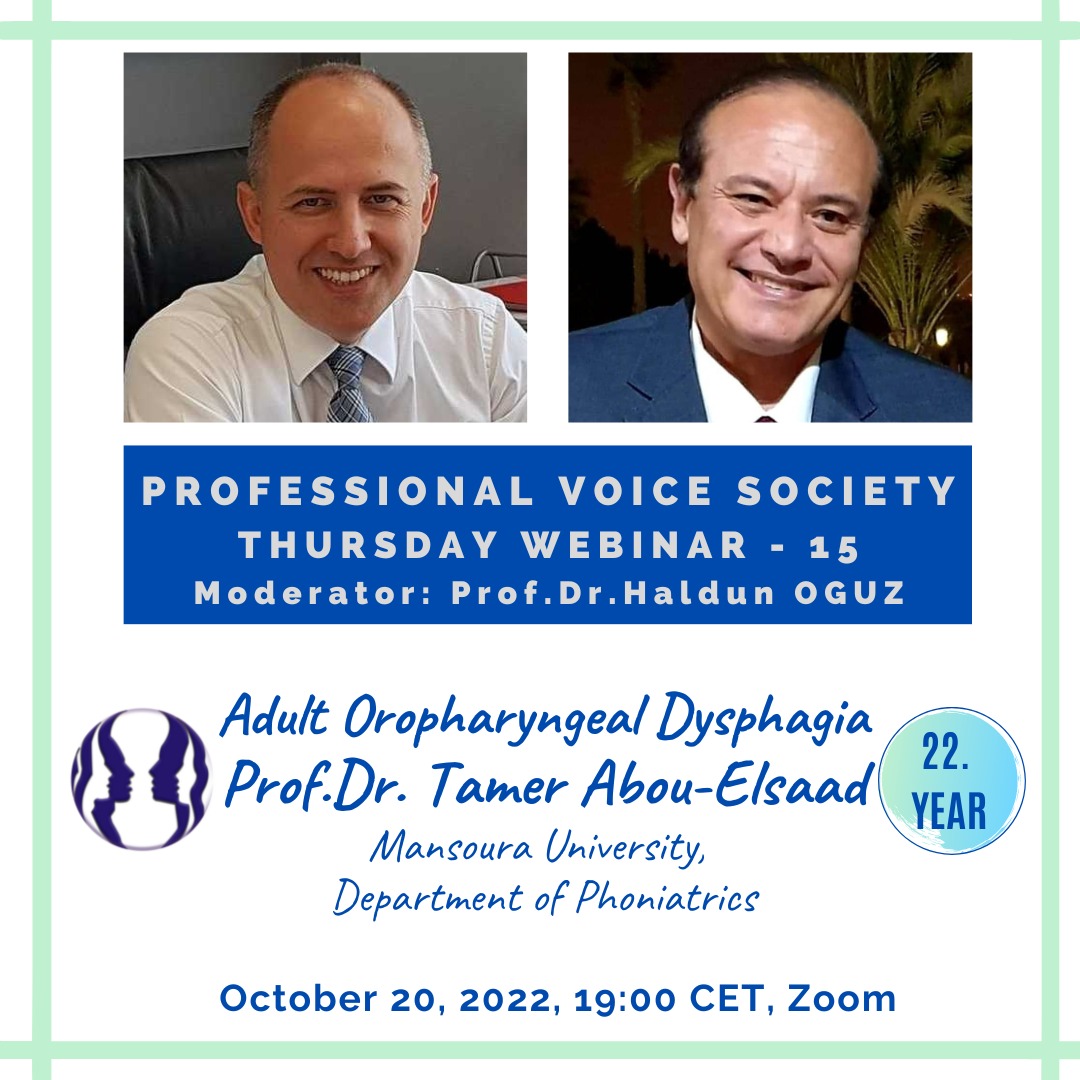 Professional Voice Society is celebrating its 22th anniversary. Each Thursday a webinar is performed by well-known speakers from the field. The topic of this week's webinar is " Adult Oropharyngeal Dysphagia”. Tamer Abou-Elsaad (Professor of Phoniatrics, ex-Head of the Phoniatric Unit and currently the Vice Dean for postgraduate studies and Research, Faculty of Medicine, Mansoura University, Egypt) will be the guest of the president of our society @profesyonelses, Prof.Dr. Haldun Oguz. The webinar will be on air at 19:00 CET (20:00 Ankara time - 19:00 Cairo time) We will be very pleased to see all of our friends with us on this meeting.