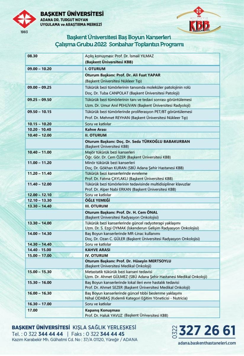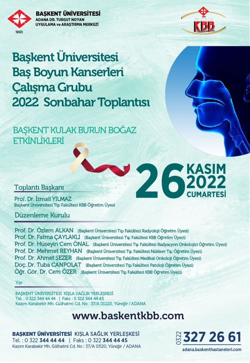 Başkent KBB Etkinlikleri kapsamında 2 senedir düzenlemekte olduğumuz ‘Baş Boyun Kanserleri Çalışma Grubu Toplantıları’nın üçüncüsünü Kasım ayı sonunda Adana’da gerçekleştireceğiz. Bu toplantılarda hem kanser gibi zor bir konu ile ilgilenen hekim gurubunu bir araya getirmeyi hem de multidisipliner yaklaşımla görüşlerimizi paylaşmayı amaçlıyoruz. Toplantıları birlikte tasarladığımız Medikal ve Radyasyon Onkolojisi hekimleri başta olmak üzere Patoloji, Nükleer Tıp ve Radyoloji bölümleri ile her toplantıda ayrı bir konunun tartışılmasını planlanmaktayız. Bu toplantıdaki alt başlığımız ise ‘Tükürük Bezi Kanserleri’ olacaktır. Konuya ilgi duyan tüm meslektaşlarımızı toplantımıza davet ediyorum. Sizleri 26 Kasım 2022 günü aramızda görmekten mutluluk duyacağız. Bu vesile ile hepinize sağlıklı günler diliyorum.