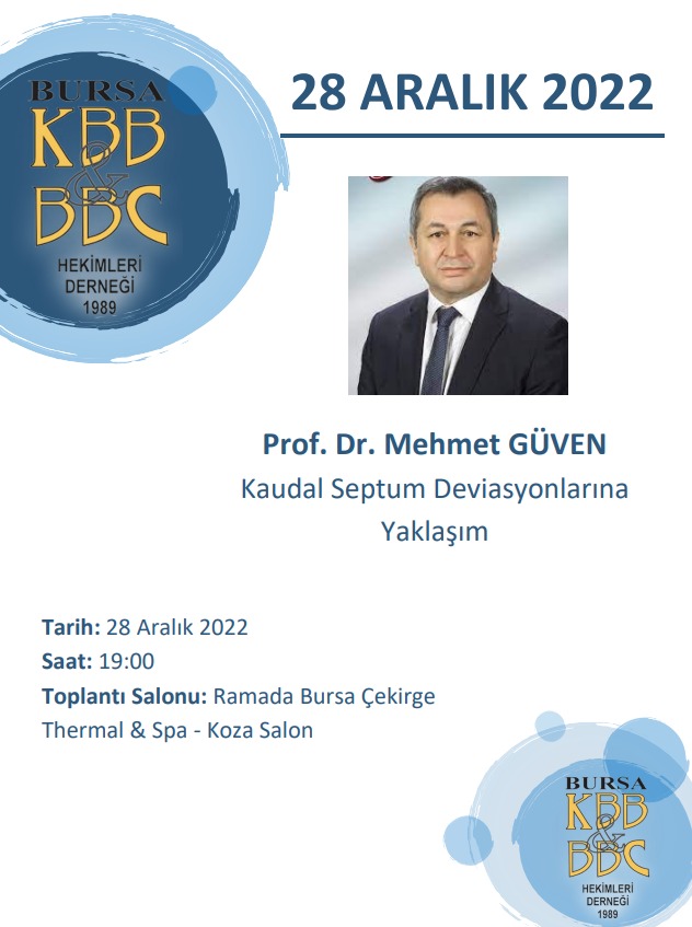Bursa KBB & BBC Hekimleri Derneği Aralık ayı bilimsel programı 28 Aralık 2022 Çarşamba Saat 19.00’da Ramada Çekirge Thermal & Spa Otel – Koza Salon’da gerçekleştirilecektir. Toplantıda Sayın Prof. Dr. Mehmet GÜVEN ‘Kaudal Septum Deviasyonlarına Yaklaşım’ başlıklı seminer sunumu ile bizlerle birlikte olacak.