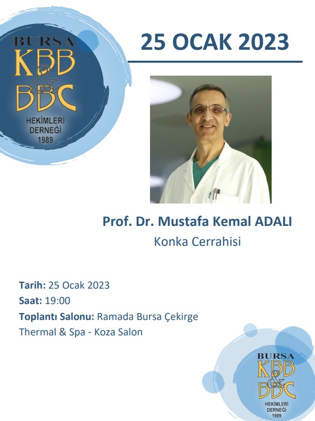 Bursa KBB & BBC Hekimleri Derneği Ocak ayı bilimsel programı 25 Ocak 2023 Çarşamba Saat 19.00’da Ramada Çekirge Thermal & Spa Otel – Koza Salon’da gerçekleştirilecektir. Toplantıda Sayın Prof. Dr. Mustafa Kemal ADALI ‘Konka Cerrahisi’ başlıklı seminer sunumu ile bizlerle birlikte olacak.