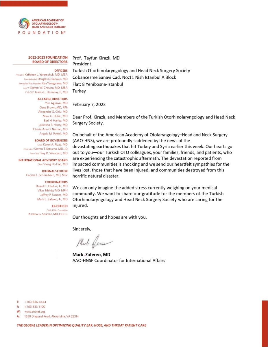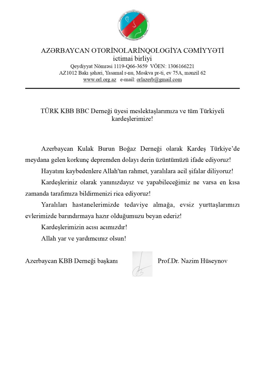 Özbekistan Kulak Burun Boğaz Derneği'nin tüm ekibi adına, depremde hayatını kaybedenler ve hayatını kaybedenler için Türk KBB Derneği'ne başsağlığı diliyoruz. Sizlerle her zaman dayanışma içindeyiz, yardım ve destek eli uzatıyoruz.