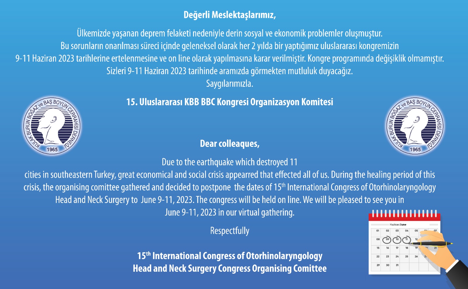 4-7 Mayıs tarihinde planlamış olduğumuz 15. Uluslararası KBB ve BBC Kongresini ertelenmiş ve kongre format değişikli yapılmıştır.
