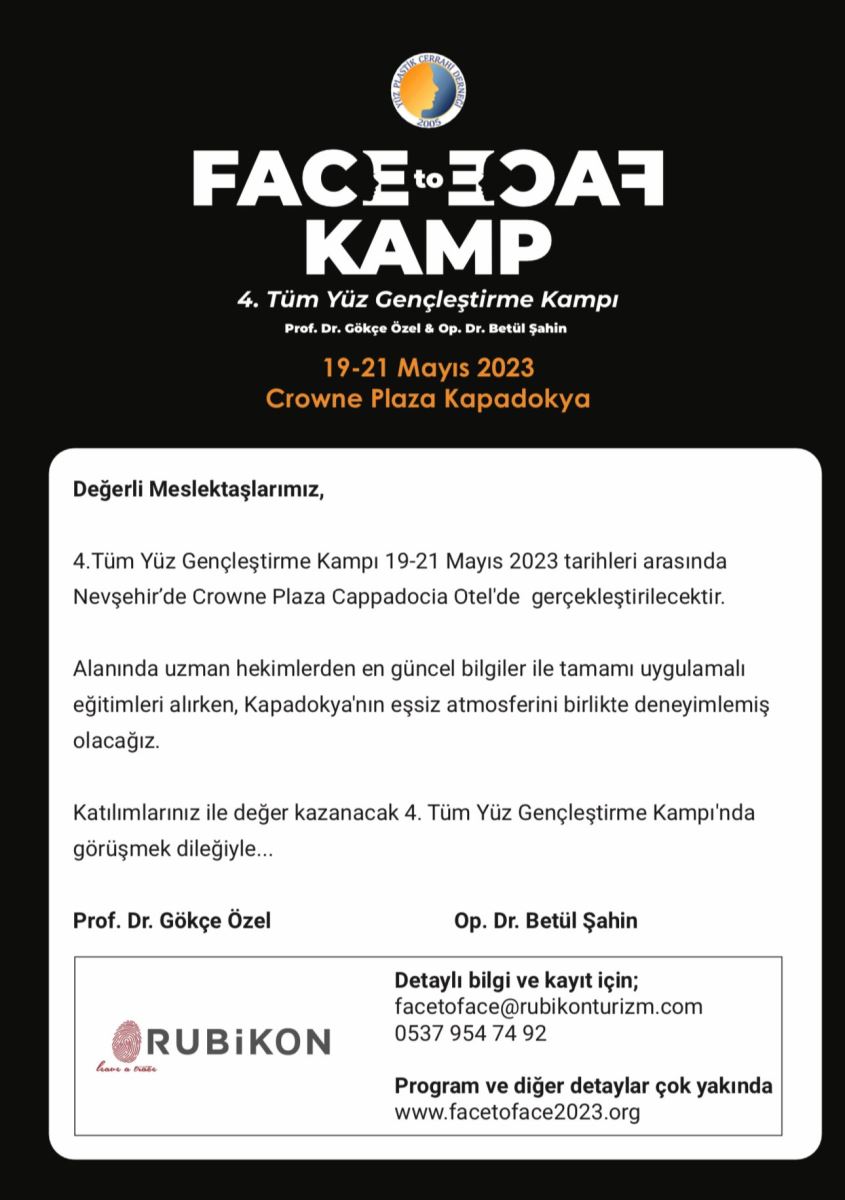 4.Tüm Yüz Gençleştirme Kampı 19-21 Mayıs 2023 tarihleri arasında Nevşehir’de Crowne Plaza Cappadocia Otel'de gerçekleştirilecektir.