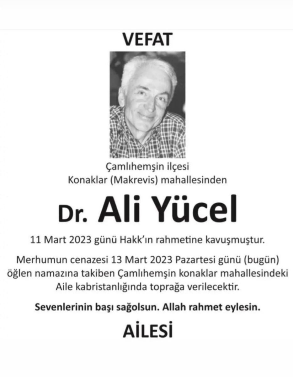 **Merhumun cenazesi yarın 13.03.2023 (Pazartesi ) günü Çamlıhemşin’de defnedilecektir.