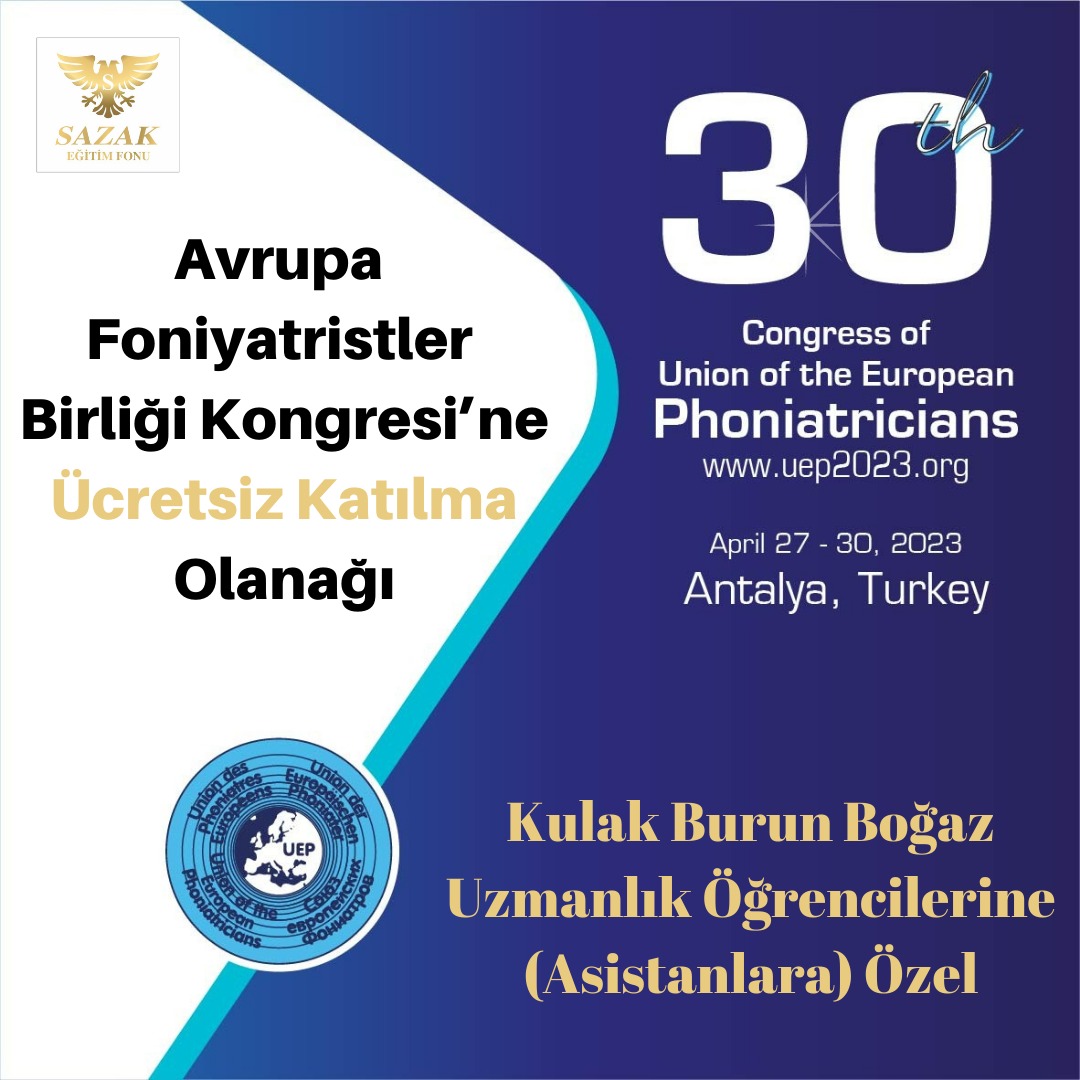 Sazak Eğitim Fonu’nun katkısı ile 8 Kulak Burun Boğaz uzmanlık öğrencisine kongreye ücretsiz olarak katılma olanağı tanınacaktır. Bu olanaktan yararlanmak isteyen asistanların güncel çalışma belgesi (Klinik Sorumlusu ya da Anabilim Dalı Başkanı imzalı), İngilizce düzeyinin 100 üzerinden en az 70 olduğunu gösteren yabancı dil belgesi (YÖKDİL, YDS, TOEFL gibi), (varsa) yayınlarını ve kısa özgeçmişlerini içeren CV ve telefon numarası bilgileri ile kbbbbc@hotmail.com adresine eposta ile başvurmaları rica olunur. Başvurular Kulak Burun Boğaz hocalarından oluşturulan bir komisyon tarafından değerlendirilecektir. Burs alması uygun görülen asistanlara telefonla bilgi verilecek ve isimleri ilan edilecektir. Başvuru için gönderdiğiniz epostanın konu kısmına lütfen “Foniyatri – UEP2023” yazınız.