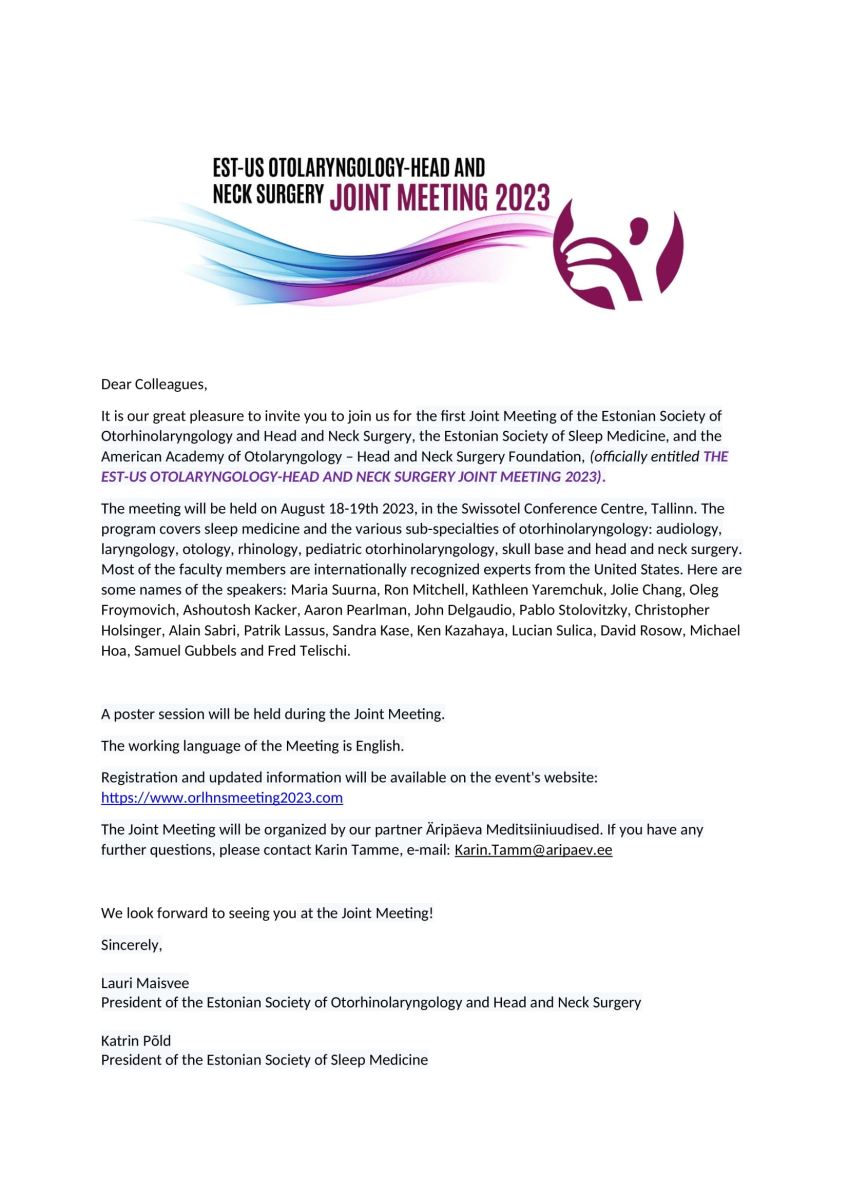 Estonia-USA Otolaryngology-Head And Neck Surgery Joıng Meetıng 2023