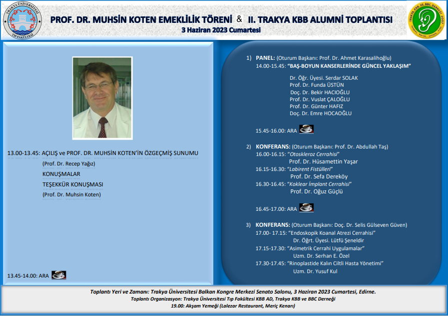 Sizleri Hocamız Prof. Dr. Muhsin Koten onuruna düzenlenecek olan Emeklilik Töreni ve 2. Trakya KBB Alumni Toplantısına davet ediyoruz. 3 Haziran Cumartesi günü Edirne’de Balkan Kongre Merkezinde buluşmak dileğiyle.