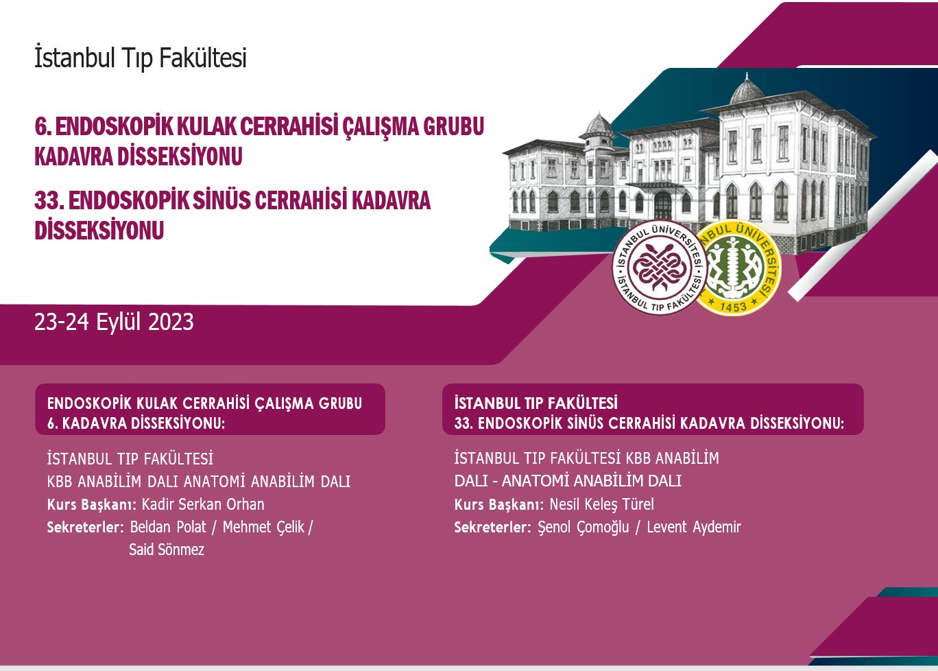 6. Endoskopik Kulak Cerrahisi Çalışma Grubu Kadavra Disseksiyonu ve İstanbul Tıp Fakültesi 33. Endoskopik Sinüs Cerrahi Kadavra Disseksiyonu Prof Dr Nesil Keleş Türel ve Prof Dr Kadir Serkan Orhan başkanlığında 23-24 Eylül 2023’de İstanbul Tıp Fakültesinde düzenlenecektir.