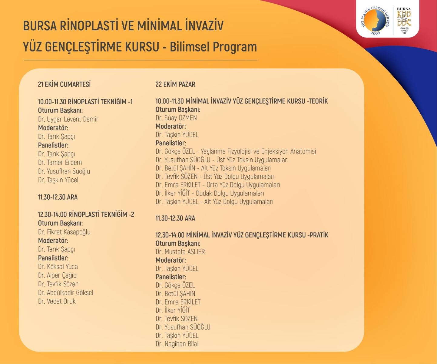 Bursa KBB ve BBC Hekimleri Derneği ile Yüz Plastik Cerrahi Derneği'nin ortaklaşa düzenlediği 'BURSA Rinoplasti ve Minimal İnvaziv Yüz Gençleştirme Kursu’na sizleri davet etmekten büyük mutluluk duyuyoruz. Bir yandan ülkemizin tek kış kongresi olan ve bu yıl 14’üncüsünü düzenleyeceğimiz ‘Uludağ KBB Günleri’ hazırlıklarına devam ederken bir yandan da sizler için ‘Rinoplasti ve Minimal İnvaziv Yüz Gençleştirme’ başlığı altında popüler ve güncel konuların ele alındığı, bilimsel değeri yüksek, keyifli bir kurs programı oluşturduk. Alanında uzman birçok kıymetli hocamızın yer aldığı, zengin içerikli ve uygulamalı kurs programının ilginizi çekeceğini düşünüyoruz.