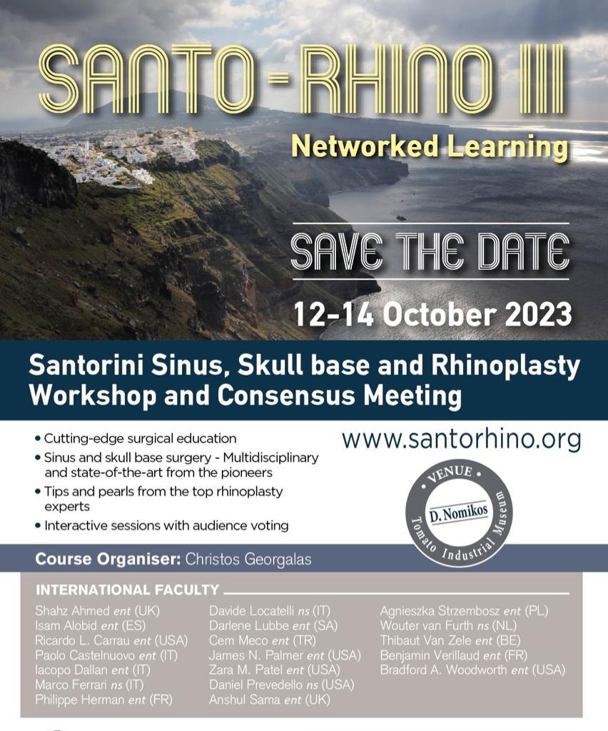 Yunanistan’ın Santorini adasında 3’üncü kez düzenlenen Endoskopik Sinüs ve Kafa tabanı cerrahileri yanında Rinoplasti oturumlarının da olduğu toplantıda konusunda çok deneyimli uluslararası konuşmacılar arasında Prof Dr Cem Meço da ülkemizi temsil etmektedir.