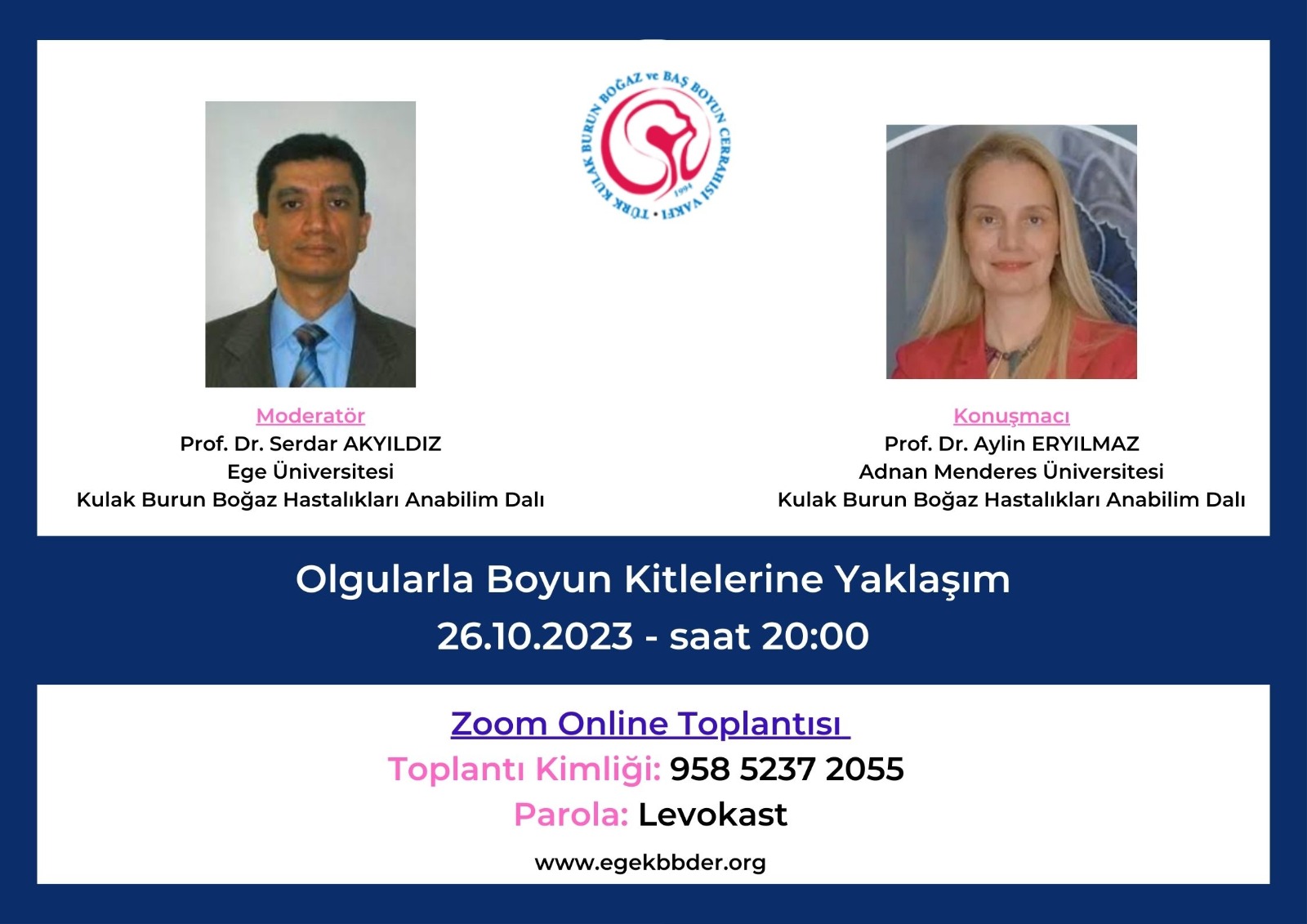 Ege KBB ve BBC Hekimleri Derneği’nin her yıl olduğu gibi bu seneki eğitim faaliyetleri de, 26.10.2023, perşembe günü Prof. Dr. Serdar AKYILDIZ’ın moderatörlüğünde Prof. Dr. Aylin ERYILMAZ’ın sunacağı “Olgularla Boyun Kitlelerine Yaklaşım” semineri ile online olarak gerçekleşecektir.