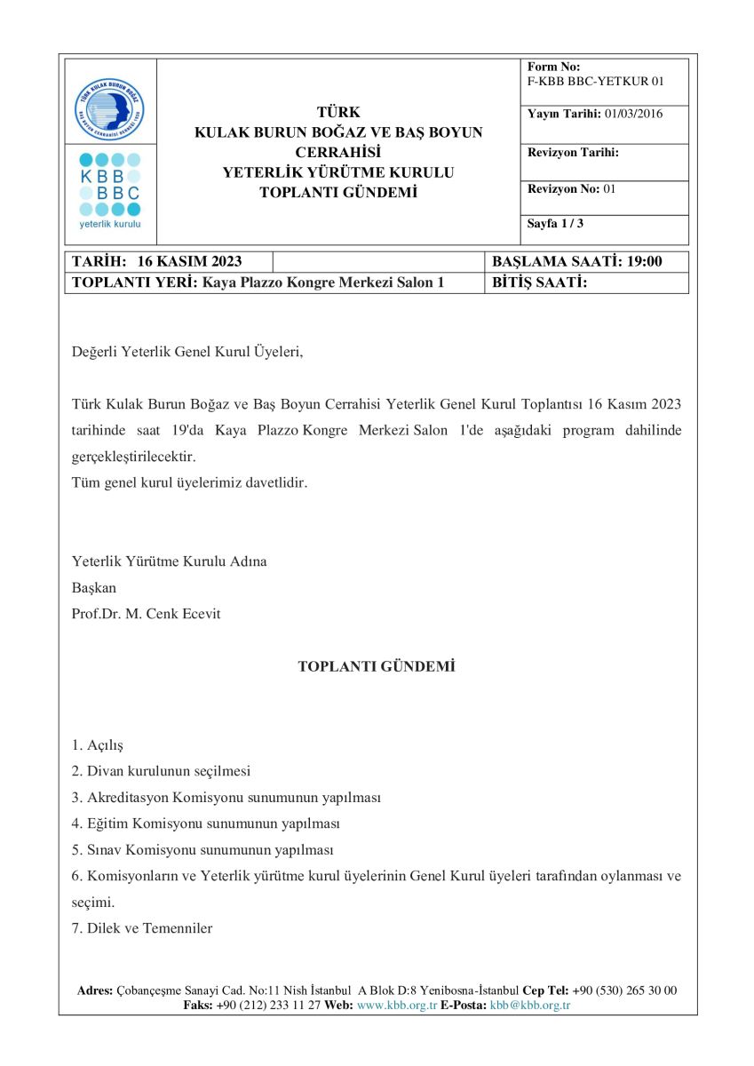 Türk Kulak Burun Boğaz ve Baş Boyun Cerrahisi Yeterlik Genel Kurul Toplantısı 16 Kasım 2023 tarihinde saat 19'da Kaya Plazzo Kongre Merkezi Salon 1' de aşağıdaki program dahilin de gerçekleştirilecektir.