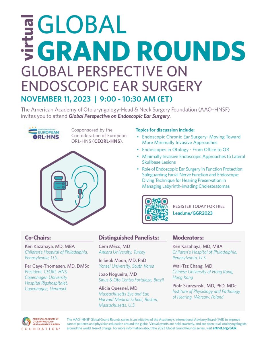 Amerikan Akademisinin “Endoskopik Kulak Cerrahisi üzerine Global bir Perspektif” konunu Webinarı 11 Kasım 2023 Cumartesi günü saat 17:00’de başlayacak olup katılım ücretsizdir.