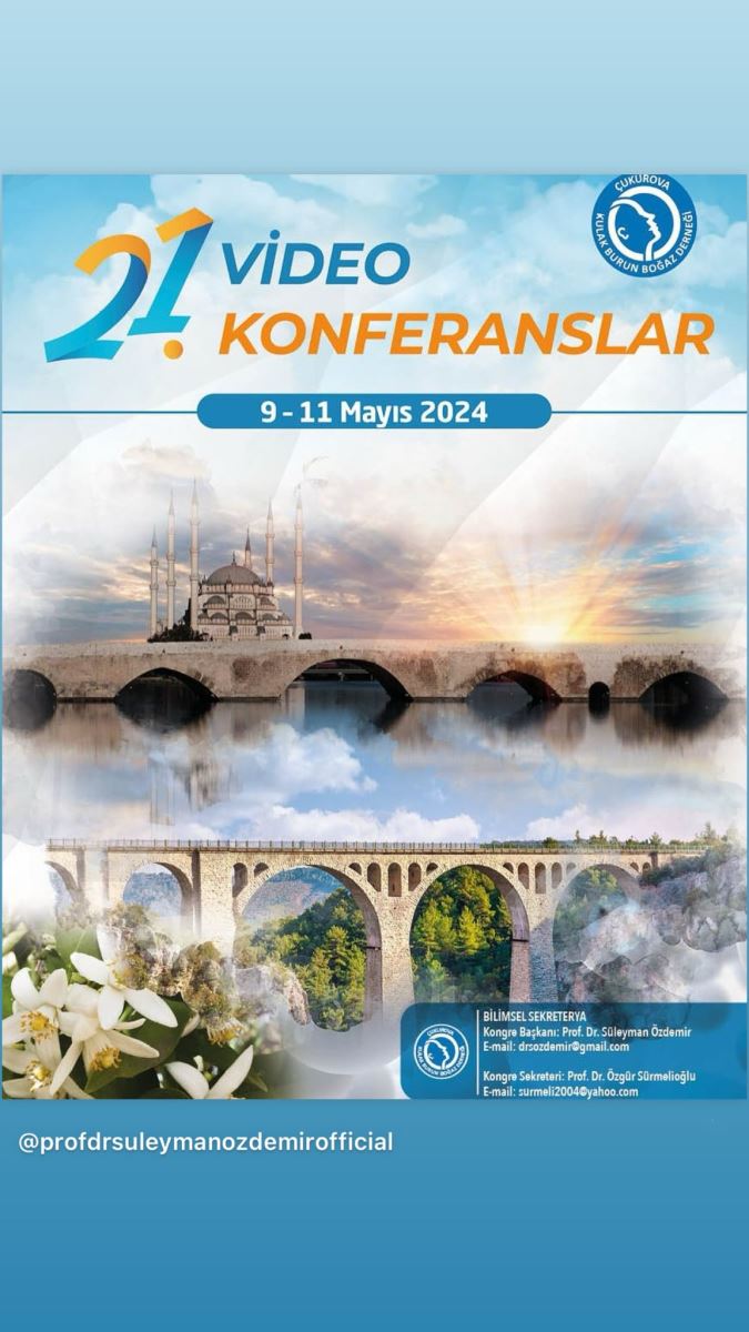 Çukurova Kulak Burun Boğaz Derneği’nin 9-11 Mayıs 2024 tarihleri arasında gerçekleştireceğimiz 21. Video Konferanslar’a sizleri davet etmekten mutluluk ve onur duymaktayız. Her yıl olduğu gibi önümüzdeki yıl da zengin bir toplantı programı ile alanlarında usta konuşmacılardan Kulak Burun Boğaz alanındaki tüm güncel konuları videolar eşliğinde izleme ve öğrenme şansınız olacaktır. 21. Video Konferanslar kapsamında önceki yıllarda olduğu gibi kadavra kursları, uygulamalı öğretici kurslar, canlı cerrahiler ve videolar eşliğinde sunumlar planlanmıştır. Yıllardır sizlerin katılımı ve destekleriyle büyüyen, sosyal açıdan ve öğreticiliği ile bağımlılık yapan toplantımıza katılımınız bizlere güç verecektir. Adana’nın sıcacık havasında, bilim, kültür ve dostluğun buluşacağı verimli bir toplantı olması dileğiyle hepinizi 21. Video Konferanslar’a bekliyoruz. Saygılarımızla.