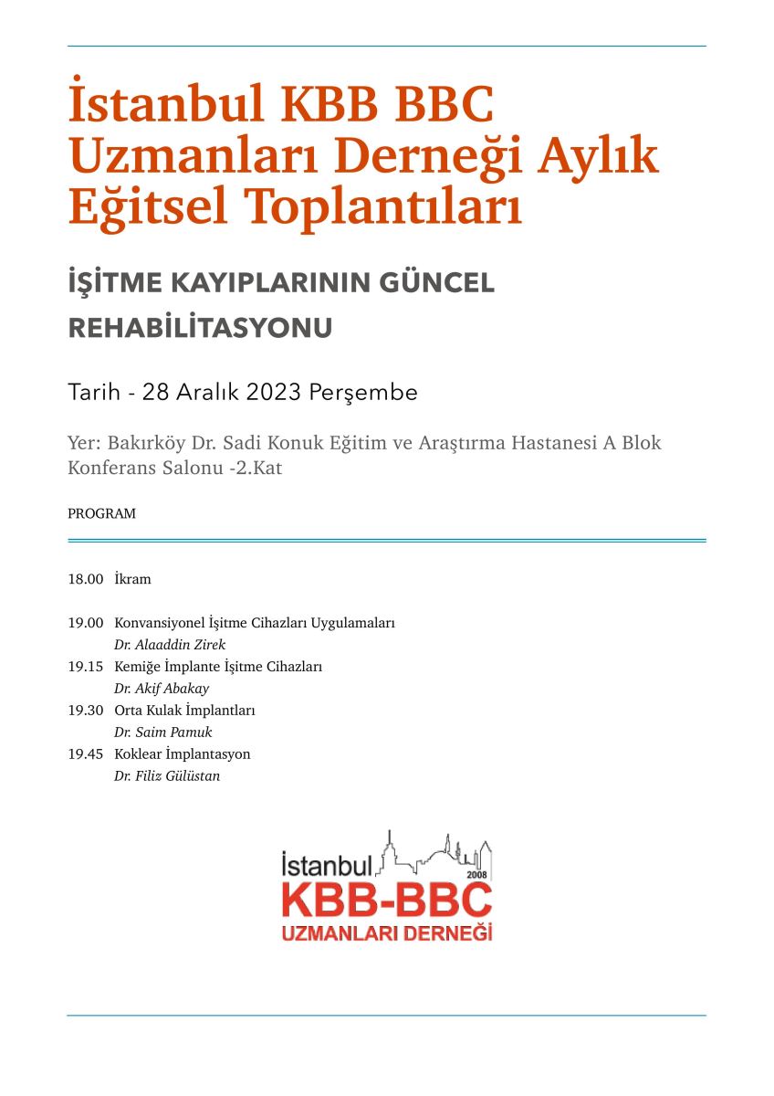 İstanbul KBB BBC Uzmanları Derneği Aylık Eğitsel Toplantıları: 28 Aralık Perşembe