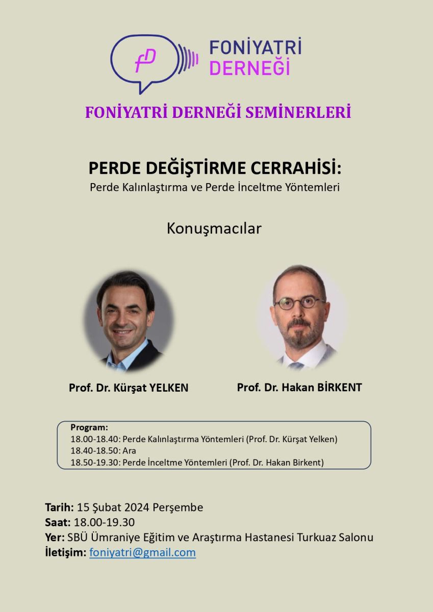 Foniyatri Derneği Seminerleri 2022-2023 eğitim sezonunda şubat ayı konusunun başlığı: “Perde Değiştirme Cerrahisi”. Konuşmacılarımız ise perde cerrahisi konusunda dünyada önde gelen iki isim, Prof. Dr. Kürşat YELKEN ve Prof. Dr. Hakan BİRKENT hocalarımız. Online yayın ve tekrar olmayacağı için konuya ilgi duyan tüm meslektaşlarımızı 15 Şubat 2024 günü saat: 18.00’de Ümraniye Eğitim ve Araştırma Hastanesine bekliyor, saygı, sevgi ve selamlarımı sunuyorum.