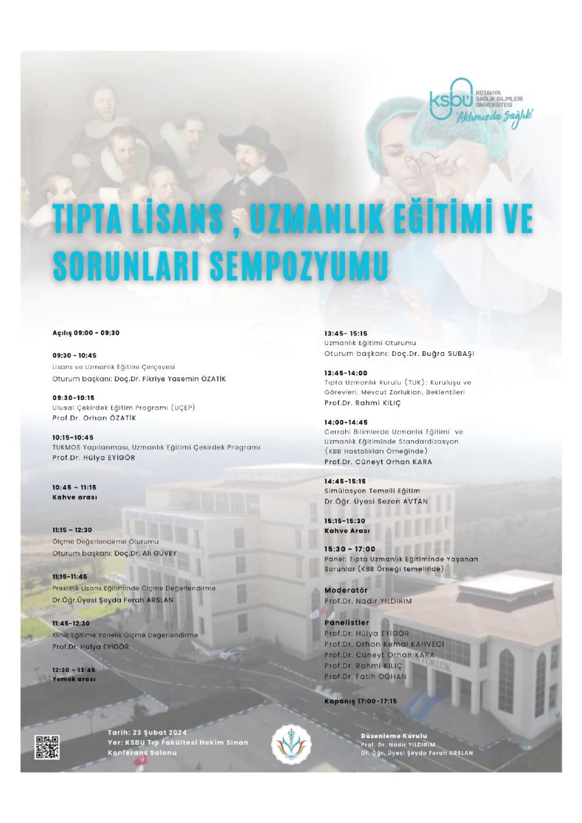 Kütahya Sağlık Bilimleri Üniversitesi’nde 23 Şubat 2024 tarihinde “Tıpta Lisans Uzmanlık Eğitimi ve Sorunları Sempozyumu” yapılacaktır. Sempozyumda KBB ve BCC akademisyenler konuşmacı ve moderatör olarak görev almışlardır.