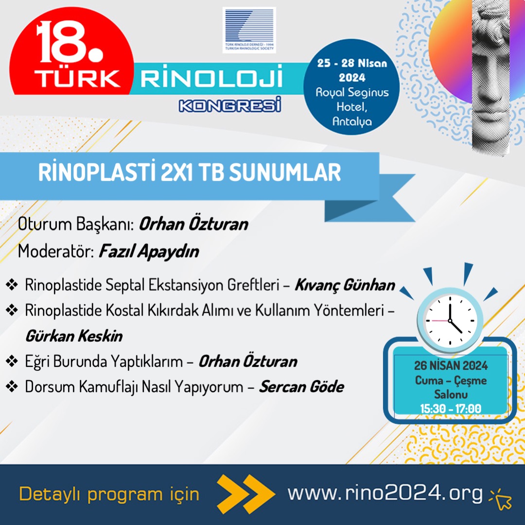 18. Türk Rinoloji Kongresi "Rinoplasti 2x1 TB Sunumlar" : 26 Nisan 2024
