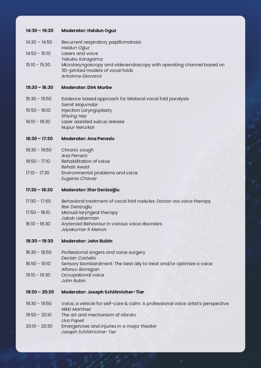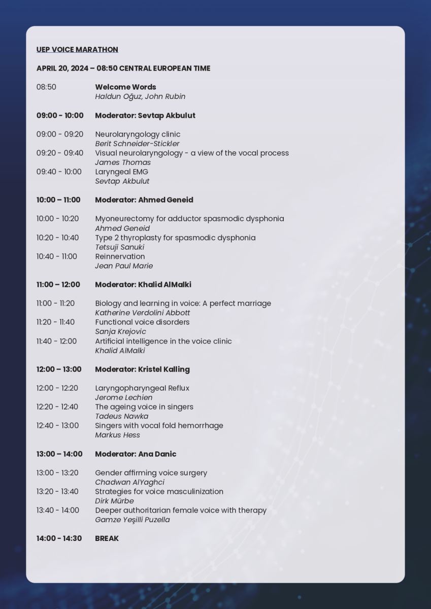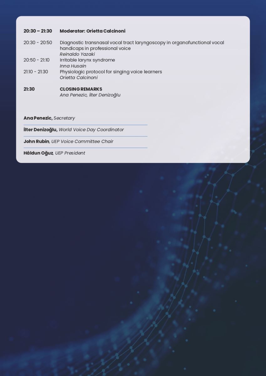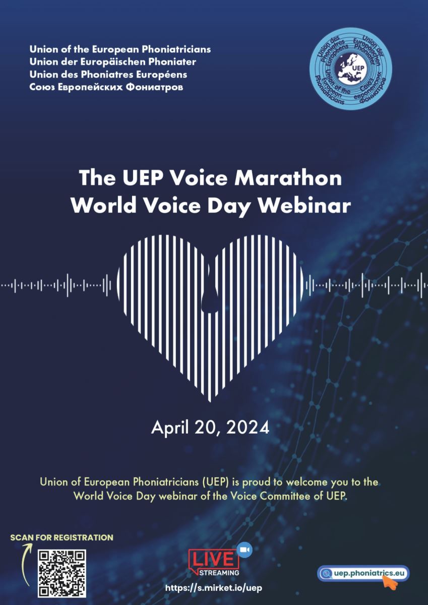 Dünya Ses Günü etkinlikleri kapsamında 20 Nisan 2024 08.50'de başlayacak olan, Union of the European Phoniatricians (UEP) başkanı Prof. Dr. Haldun Oğuz'un başkanlığında ve tüm gün sürecek olan, Foniyatri ve Ses Hastalıkları hakkında profesyonel ses, vokal patolojier, foniyatrik cerrahi ve vokal rehabilitasyon konularında uluslararası konuşmacıların yer alacağı ve ülkemizden de Prof. Dr. Sevtap Akbulut ile Prof. Dr. İlter Denizoğlu'nun da yer aldığı webinara sizleri davet ediyoruz.