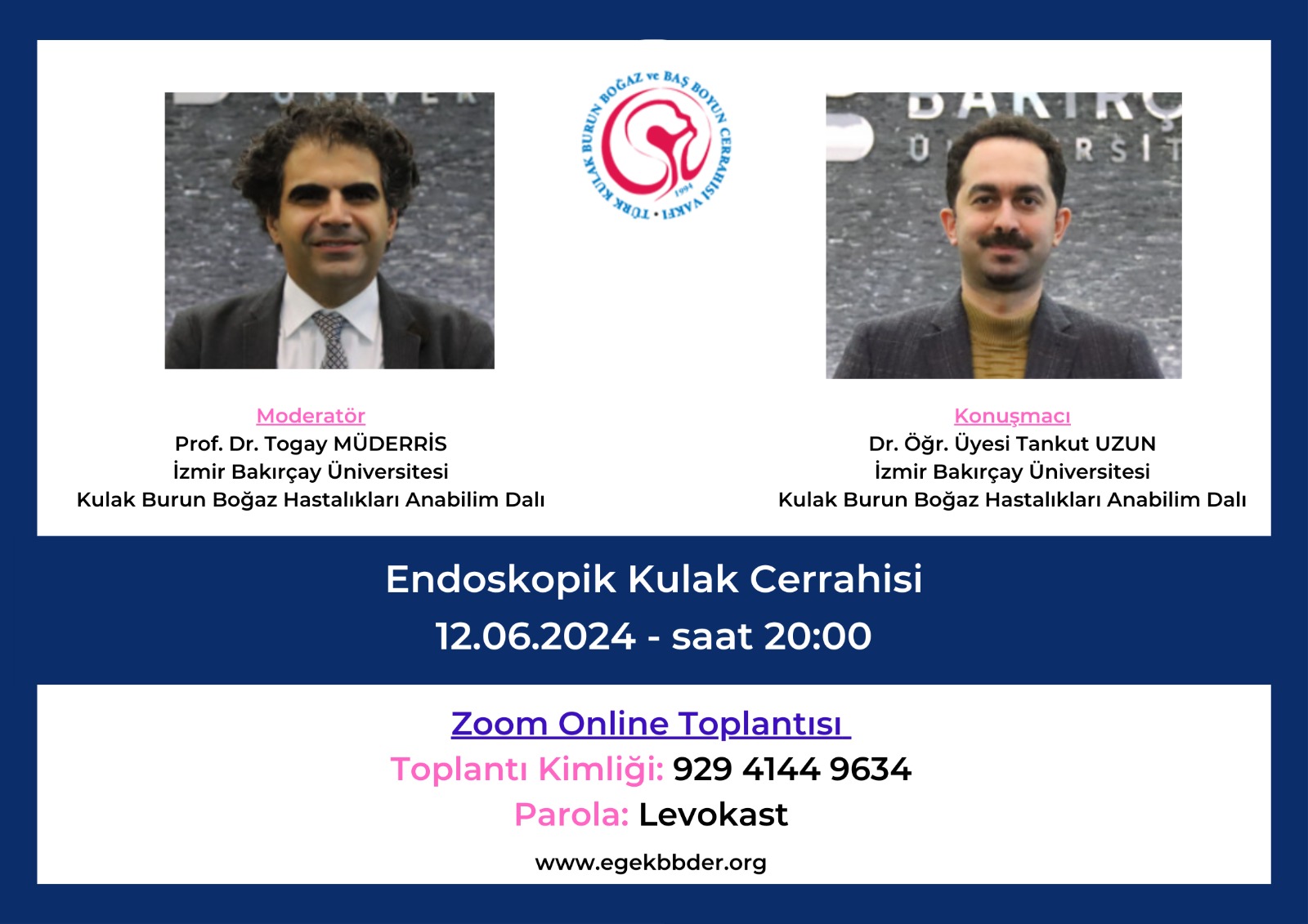 Türk Kulak Burun Boğaz ve Baş Boyun Cerrahisi Vakfı, İzmir Şubesinin konferans serileri kapsamında 12.06.2024, çarşamba günü saat 20.00 da Dr. Öğr. Üyesi. Tankut UZUN'un "Endoskopik Kulak Cerrahisi" konulu sunumu online olarak gerçekleşecektir.