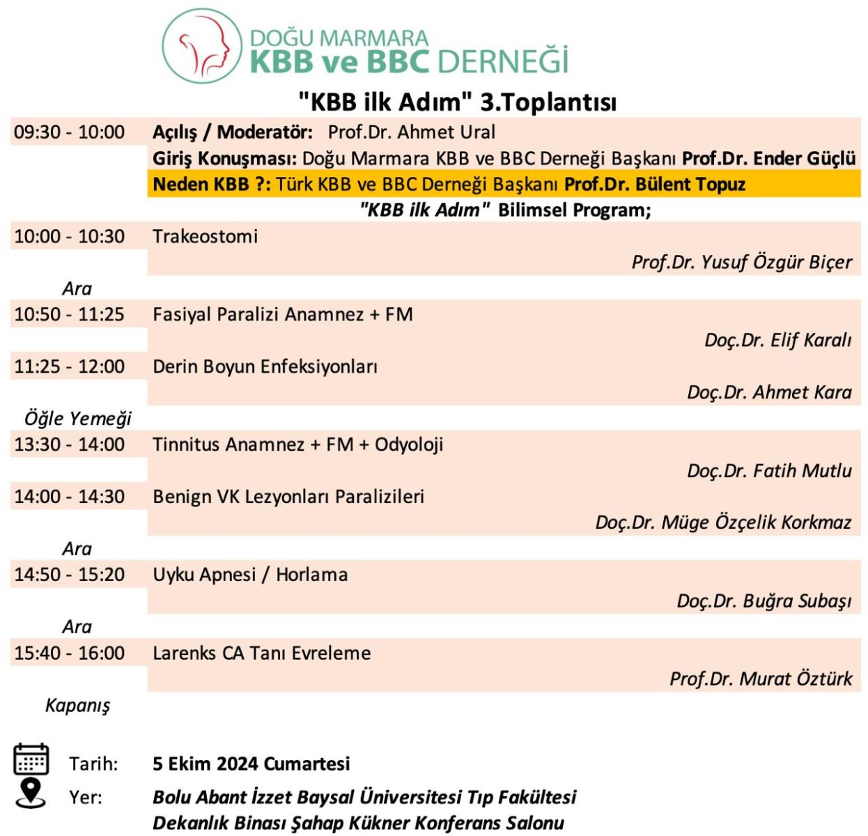 Doğu Marmara KBB ve BBC Derneği tarafından, özellikle son dönemde daha yüksek sayıda KBB'a yeni başlayan meslektaşlarımız için, daha hızlı ve iyi adapte olabilmelerini sağlayabilmek adına, temel düzeyde "KBB ilk Adım" toplantısının 3.sü 5 Ekim 2024 tarihinde düzenlenecektir. Program ekte sunulmuştur.